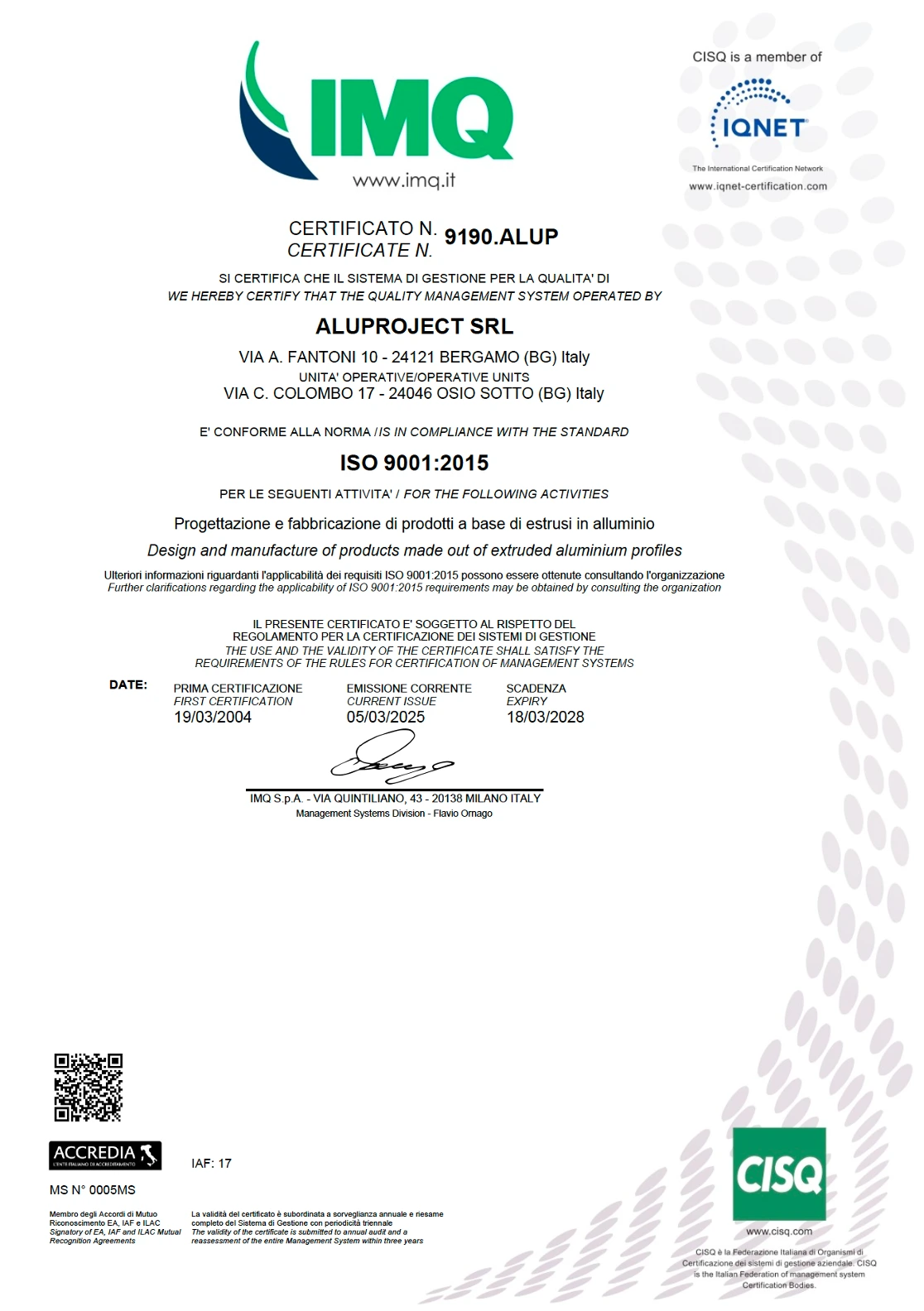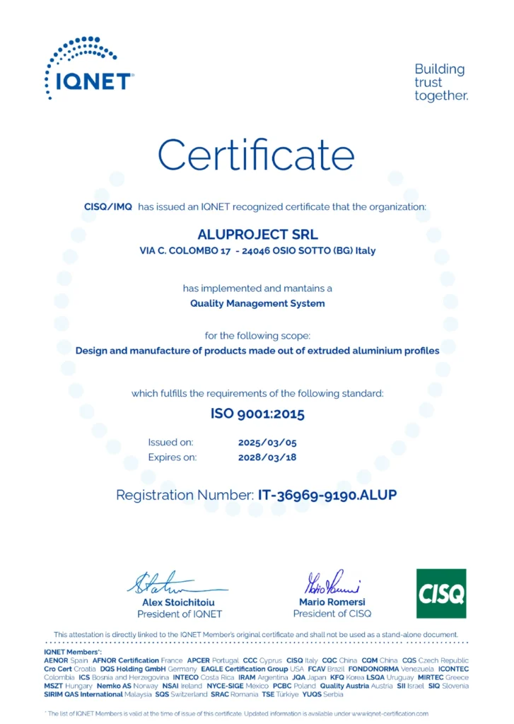 Aluproject opererer efter et kvalitetskontrolsystem certificeret af CSQ